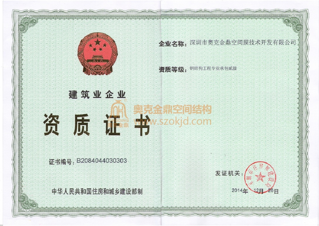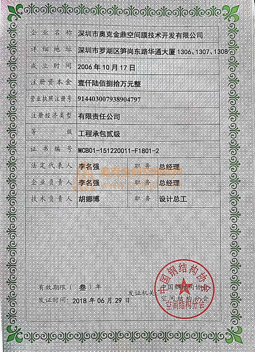 鋼結構工程安裝貳級,膜結構工程設計壹級,膜結構工程施工壹級,具備安全生產許可證。